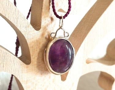 Handmade sterling silver drop earrings with oval purple amethyst gemstones on a wooden background.